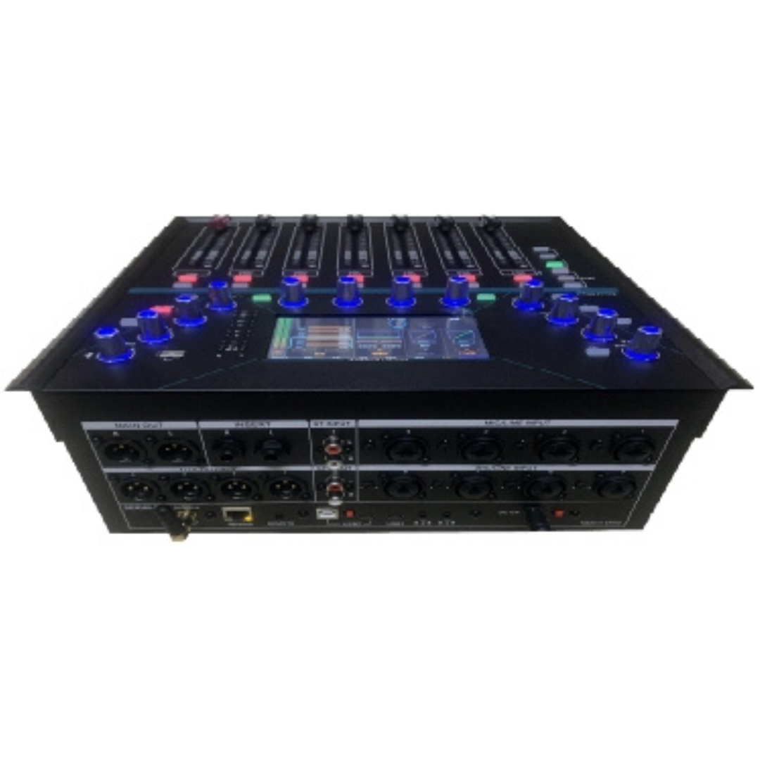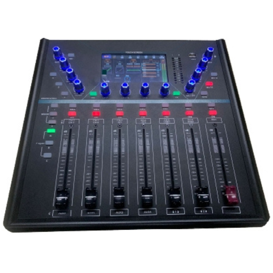 The X12 is a next-generation digital mixer featuring a 7” HD touchscreen, motorized faders, dual USB soundcards, and full DSP control. Perfect for pro audio installations, touring, and streaming.